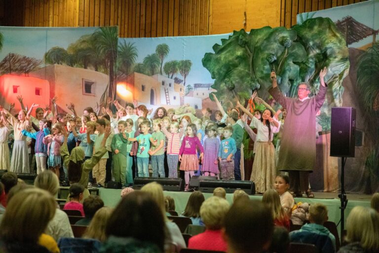 Es ist immer noch dunkel, aber ich höre jetzt Stimmen und da: Es ist hell! Jetzt werde ich endlich aus meinem Case rausgelassen und auf den Techniktisch gelegt. Direkt neben meinen besten Freund, das Mischpult. Von hier aus hab ich den perfekten Überblick. Die Kinder sind auch schon da. Und jetzt mein Einsatz: Ich werde für die Begrüßung verwendet! Über 50 Kinder sind gekommen, um bis Mittwoch gemeinsam das Musical „Von Gott berufen – Paulus – Botschafter Jesu“ einzustudieren. Dann fangen sie auch schon an zu proben, denn am nächsten Tag werden sie eine Messe gestalten. Einen Teil von einem der Lieder kann sogar ich schon: „Ja, das glaube ich! Ja, das glaube ich! Ja, das glaube ich, groß ist Gott!“ Abends gibt es einen großen Segensteil, bei dem die Kinder sich gegenseitig segnen, aber auch Michaela, eine der Veranstalterinnen, wird besonders gesegnet, denn nachdem sie 10 Jahre lang Musicalwochen organisiert hat, hört sie nun damit auf.